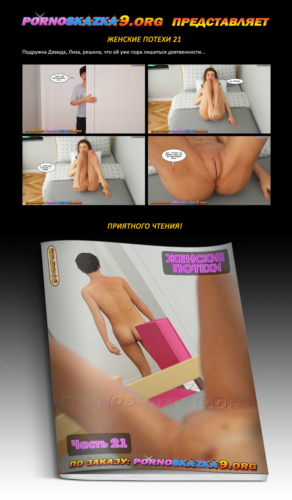 Порно комикс «Женские потехи. Часть 21». Оказывается, у Дэвида есть подружка, Лиза, с которой он встречается уже несколько месяцев. Неизвестно откуда, но Лиза узнала, как именно Дэвид зарабатывает на жизнь, и решила выяснить отношения…